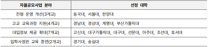 <표 1> 2025학년도 고교교육 기여대학 지원사업 자율공모사업 선정 결과¹