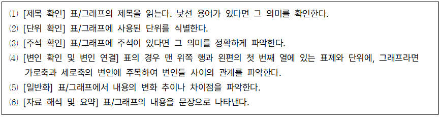 표는 데이터 전체를 있는 그대로 제시할 수 있으며, 그래프는 데이터에서 중요한 부분을 부각하거나 데이터의 상관관계, 자료의 경향성 및 추세 등을 보여 줄 수 있다. 이러한 표와 그래프를 정확하게 해석하고 여기에 담긴 함축적 의미를 바르게 파악한다면 현상에 대한 정확한 이해와 판단이 가능하다. 표와 그래프의 정확한 분석을 위한 과정은 다음과 같이 정리해 볼 수 있다.