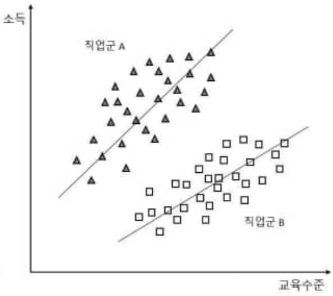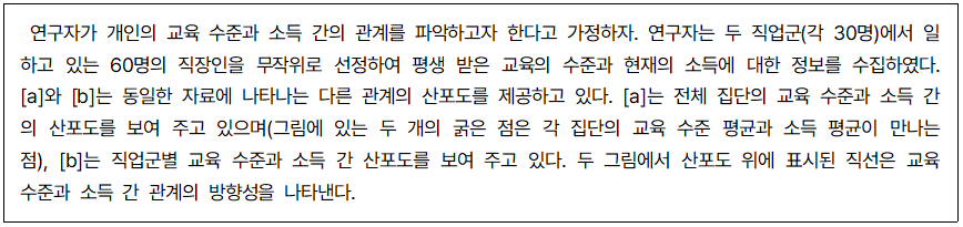 <자료 3>에 제시된 정보와 ‘교육 수준과 소득의 전체 집단 관계’, ‘교육 수준과 소득의 직업군별 관계’라는 그래프의 제목을 참고하여 자료가 담고 있는 정보를 살펴보자. [a]는 각 직업 집단의 평균 교육 수준과 평균 교육 소득이 가지고 있는 부적 관계(음의 관계)를 보여 주고 있으며, [b]는 각 집단 내에서 개인의 교육 수준과 개인의 소득이 가지고 있는 정적 관계(양의 관계)를 보여 주고 있다. [a]를 보면, 전체적으로 교육 수준이 증가함에 따라 소득이 감소하는 패턴이 있는데, 이는 각 집단의 평균점을 이용하여 그은 선의 방향과 일치한다. 즉, 각 직업군의 교육 수준 평균과 소득 평균을 이용하여 교육 수준과 소득의 관계를 보여 주는 것이다. 한편, [b]는 각 직업 집단별로 개인의 교육 수준과 소득의 관계를 보여 주고 있다. 각 집단 내에서 직장인들은 교육 수준이 증가함에 따라 소득도 증가하는 패턴을 보여 주며, 이는 집단의 평균들을 이용하여 분석한 패턴과는 다르다. 따라서 수험생들은 변수 수준을 구분하여 전체 분포가 주는 메시지([a])와, 하위 집단 통제 후 패턴([b])이 주는 메시지를 구별하여 이해할 수 있어야 한다.
