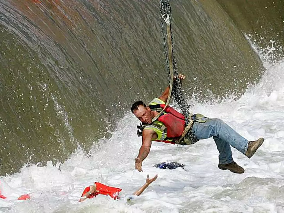 이 사진은 댐 아래 급류에 빠진 여성을 임시 구조 장비를 이용해 구하려는 건설 근로자의 모습을 담고 있다. 이 근로자는 임시로 만든 밧줄을 연결한 뒤 구조에 나섰다. 사진의 구성 요소는 ‘물에 빠진 사람의 손’, ‘구조하려는 사람의 모습’, ‘거센 물줄기’이다. 그리고 거센 물줄기를 통해 상황의 긴박함이 표현되고 있는데, 여성은 포말 가득한 강물 위에 매달려 있는 상태로, 구조되지 못할 경우 즉각적인 위기에 처하리라는 절박함이 강하게 느껴진다. 물에 빠진 이의 손과 구하려는 이의 손이 닿을 듯 말 듯한 모습을 통해 구조를 바라는 간절함과 이 사람을 구하고자 하는 또 다른 이의 간절함을 느낄 수 있다. 위기 상황에서 ‘행동의 순간’을 보여 주는 사진으로, 전체적으로는 강렬한 휴머니즘을 느끼게 한다. 이처럼 한 장의 사진은 많은 메시지를 담고 있으며, 보는 이의 공감과 몰입을 이끌어 낼 수 있다.