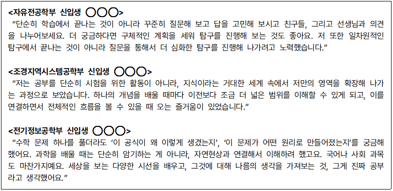 다음의 인터뷰 내용은 학업역량의 우수성을 확인할 수 있는 서울대 합격 학생들의 사례들이다. 이를 바탕으로 고등학교 생활에서 어떤 학업역량을 키워야 할지와 어떤 자세와 태도를 갖춰야 할지 고민해 보자.