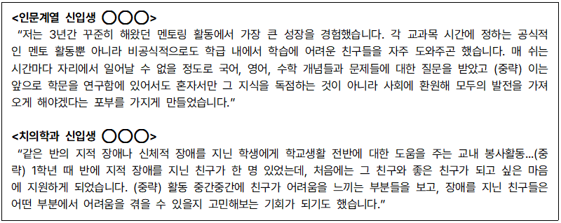 다음의 인터뷰 내용은 학업 외 소양의 우수성을 확인할 수 있는 서울대 합격 학생들의 사례들이다. 이를 바탕으로 서울대가 뽑고자 하는 학생들이 어떤 학생인지 생각해 보자.