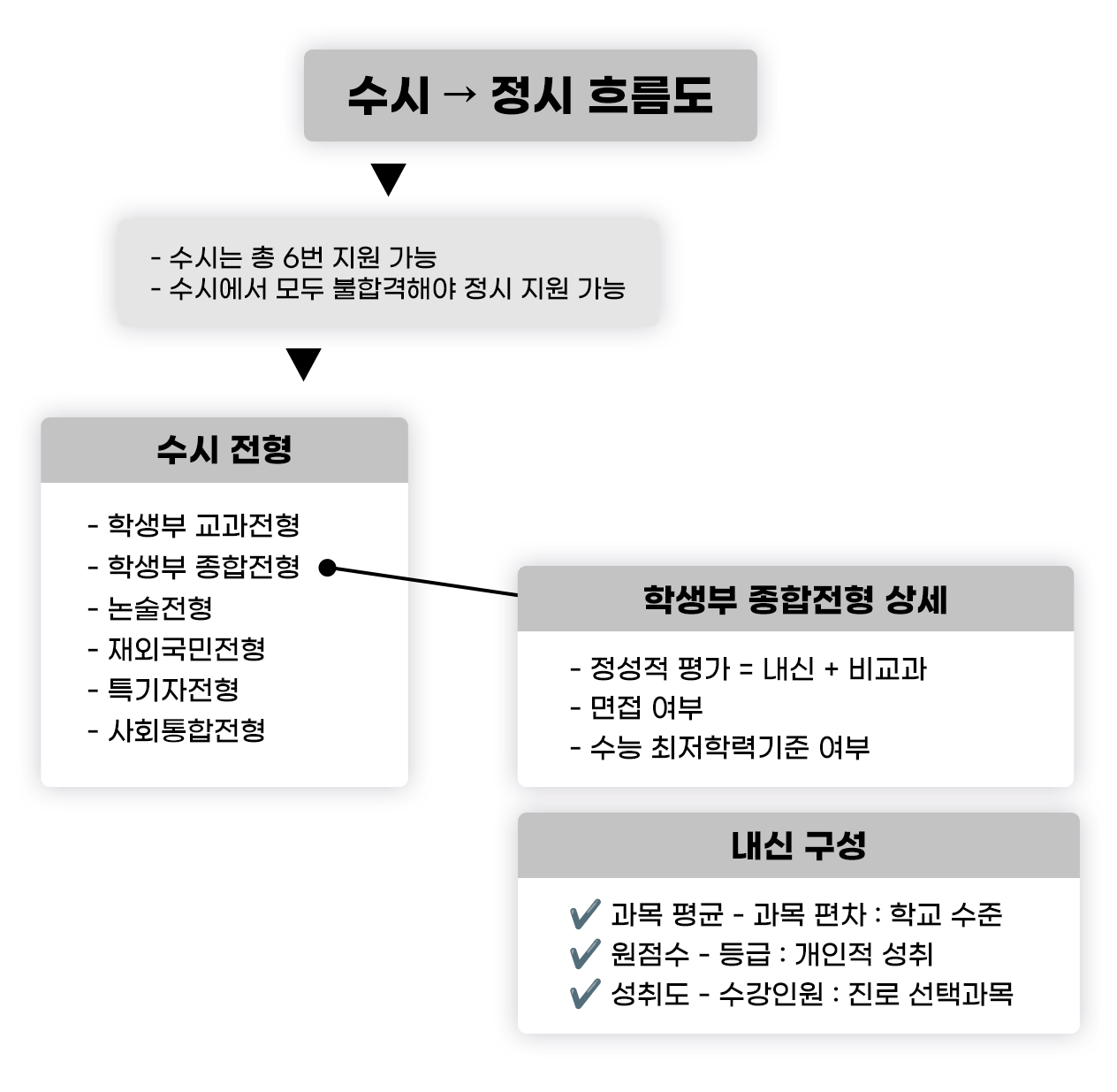 * 지금의 대학입시는 1980년대의 ‘전기/후기 같은 단순 구분이 아니라, 수시/정시라는 두 축을 중심으로 수시는 학생부교과, 학생부종합, 논술, 특기자 등 여러 가지 전형으로 나뉘고 학생부종합전형으로 지원을 한다면 내신과 비교과 관리가 필요합니다.