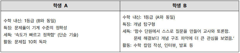<자료 2> 실제 정성평가의 두 학생 사례(가상)