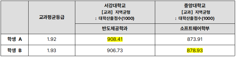 예를 들어, <표 2>의 사례를 보면, 교과평균등급이 차이나는 두 학생이 서강대학교의 교과성적 반영 방식에 따르면 ‘학생 A’가 ‘학생 B’보다 더 높은 점수를 받습니다. 그러나 중앙대학교의 환산 방식을 적용하면 결과가 반대로 나타나 ‘학생 B’가 ‘학생 A’보다 높은 점수를 얻게 됩니다.