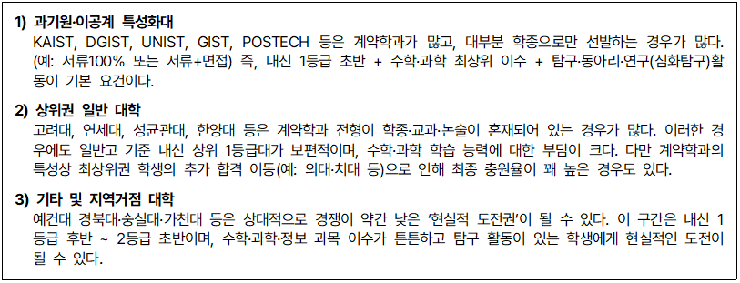 실제 학교 현장에서 상담을 통해 계약학과를 권하게 되는 학생 유형은 의대까지는 아니지만 확실한 취업과 높은 연봉을 원한다는 자연계 상위권 학생, A.I.·반도체·모빌리티·SW 등 특정 분야에 강한 흥미와 재능을 가진 학생, 내신과 수능 점수가 아주 약간 아쉬운 최상위권, 그러나 각종 활동이나 탐구 능력은 탄탄한 학생, 이렇게 정리해 볼 수 있다. 이들이 만일 계약학과를 쓰겠노라고 마음을 먹으면 진학 담당 교사는 이들에게, 고1-고3 전 과정에서의 진로 일관성이 있는지, 심화된 자기 주도적인 탐구 경험이 있는지(단순 유무를 넘어선 깊이 있는 활동의 여부), 다양한 산업 구조(반도체·배터리·모빌리티·통신·플랫폼 등)에 대한 기본적인 이해가 있는지, 그리고 마지막으로 자신에게 ‘나는 공학이 좋은가? 나에게 공학이 정말 걸맞은가?’라는 질문에 솔직하게 명확한 답변을 할 수 있는지를 통해 학생을 구별하여 권유를 고민하게 된다.