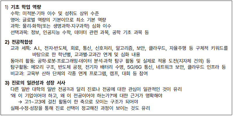 이러한 학과들을 학종으로 도전하려면 무엇을 준비해야 할까? 먼저, 계약학과 학종은 기업 맞춤형 이공계 인재를 선발한다는 점을 먼저 주목해야 한다. 해당 기업의 홈페이지를 통해 사전 정보를 취득하고 이를 중심으로 키워 나가야 할 역량²을 중심으로 학교생활을 하는 것도 하나의 팁이 될 수 있다.