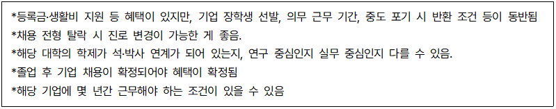 무엇보다 중요한 것은 이러한 역량이 드러난다 해도, 대학 입학 이후에도 성적과 역량을 유지한 채 해당 기업의 채용 선발을 통과해야 목표를 달성할 수 있다는 점을 간과해서는 안된다. 따라서 ‘입시에만 성공하면 끝’이라는 생각은 지양해야 한다. ‘꿈의 학과’인 동시에 생각보다 조건이 까다롭다. 계약학과는 흔히 ‘등록금 전액 + 졸업 후 대기업 행’에 주목하지만 실제로는 아래와 같은 조건이 있다는 것을 놓치면 안된다.