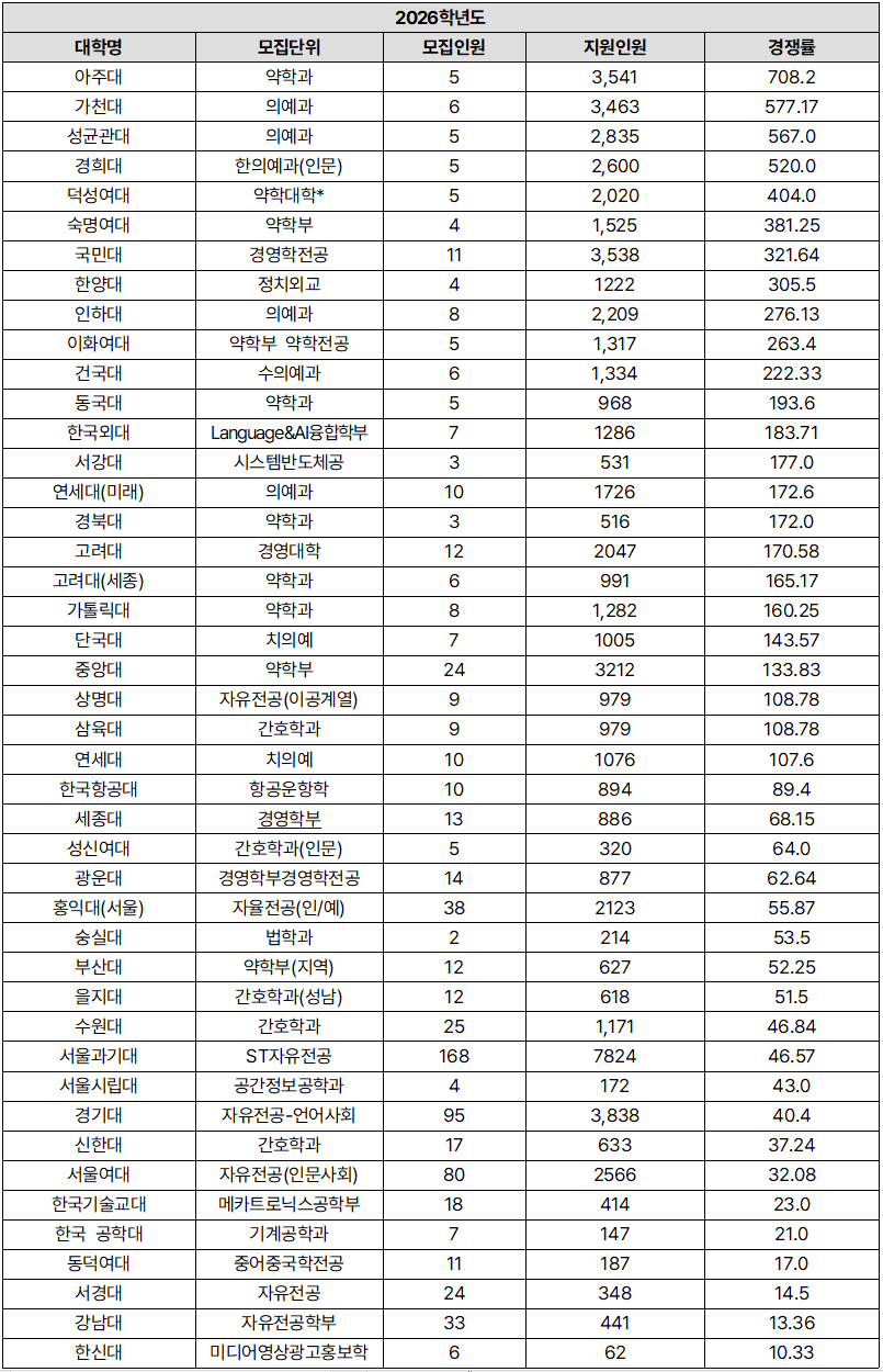 위에서는 2026학년도 경쟁률 변화를 간략하게 살펴보았다. 경쟁률을 통해 지원자의 지원 경향성을 살펴보는 것도 지원자에게는 도움이 되지 않을까 생각한다. 다음 호에는 2027학년도 입시 변화와 2026학년도 약술형 논술을 정리해 보고자 한다.