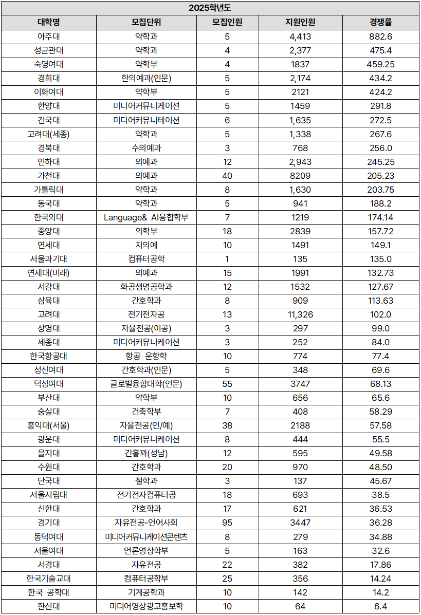 <도표 3> 2025학년도 대학별 최고 경쟁률 학과