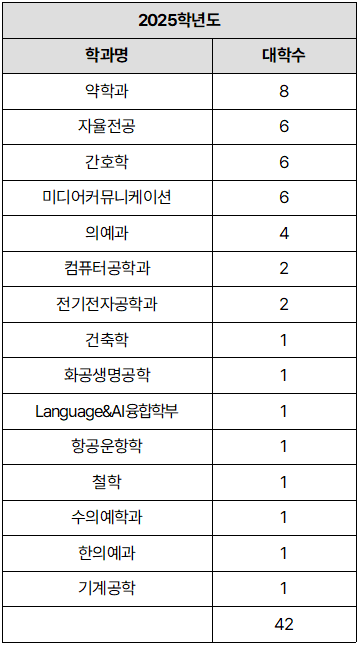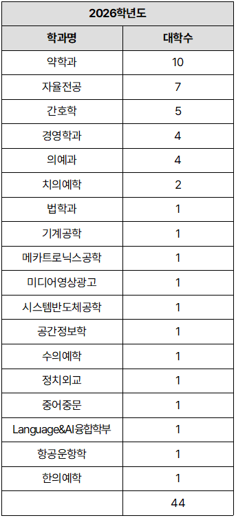 <도표 4>에서 볼 수 있듯이 대학교에서 가장 지원율이 높은 학교는 각 학교의 대표학과들이 주를 이루고 있다는 것을 볼 수 있다. 2025학년도는 약학과 8개 대학, 자율전공 6개 대학, 간호학과가 6개 대학, 미디어커뮤니케이션학과 6개 대학 등이 상위 경쟁률을 보이고 있다. 그 뒤로 의예과 4개 대학이 뒤를 잇고 있다. 다만 전년도 단국대학교 철학과가 최상위 경쟁률을 보인 것은 이례적인 것으로 볼 수 있다. 반면, 2026학년도에는 약학과 10개 대학(2개교 증가), 자율전공 7개 대학 (1개교 증가), 간호학과 5개 대학(1개교 감소), 경영과 의예과가 4개 대학으로 뒤를 잇고 있다. 눈에 띄는 학과는 정치외교 1개교 중어중문학과 1개교가 있다. 전반적으로 약학과, 자율전공, 간호학과의 경우 대부분의 학생이 선호하는 학과인 것을 알 수 있다. 다만 의약계열 개설 모든 학과의 경우 이와 못지않는 경쟁률을 보이고 있다. 하지만, 약학과에 대한 학생들의 수요가 전년도부터 대학의 경쟁률을 이끌고 있다는 것을 올해도 확인할 수 있었다. 특히, 올해만 실시된 단국대학교 치의예과의 경우 140대 1 이상의 경쟁률을 보였다는 점에서 2027년도에 실시하지 않는 것이 아쉬움이 남는다.