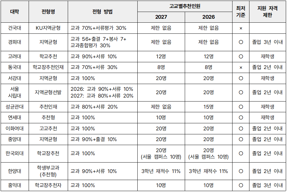 또한 대학별 지원 자격을 면밀하게 살펴야 합니다. <표 1>과 같이 졸업생 지원 가능 여부에 따라 경쟁 구도가 달라집니다. 고려대, 서강대, 서울교대, 성균관대, 연세대처럼 '재학생'에게만 추천권을 부여하는 대학의 경우, 졸업생과의 경쟁을 피할 수 있어 현 고3 학생들에게 전략적으로 매우 유리한 선택지가 될 수 있습니다. 물론 지금 안내하는 2027 대입 정보는 각 대학이 발표한 '대입전형 시행계획'을 바탕으로 작성되었습니다. 대입 체제의 특성상, 세부 사항은 2026년 4월경 발표될 대학별 최종 모집요강에 따라 일부 변동될 수 있습니다.