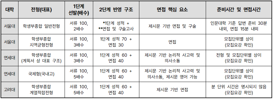 • 면접 및 구술고사 : 대학에 따라 제시문 기반 면접과 구술 요소를 결합한 평가 명칭