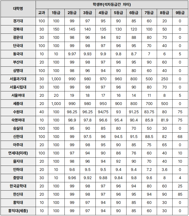 그렇다면 대학별 학생부 석차등급간 차이는 어떻게 될까?