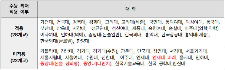 다음은 수능 최저 적용 관련 대학들이다.