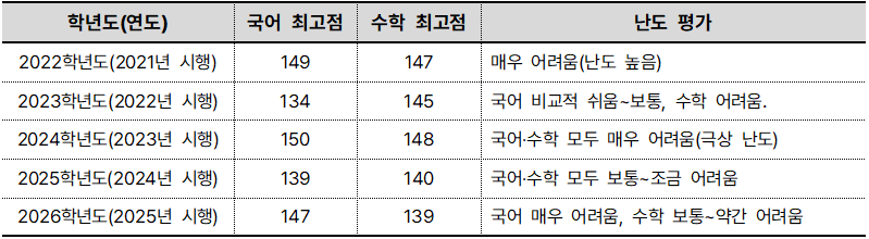 <표 1> 수능 국어‧수학 표준점수 최고점 비교