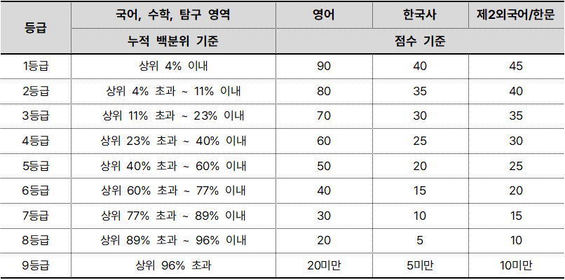 국어, 수학, 탐구 영역의 등급은 전국 백분위를 일정 구간으로 나누어 제시한 값이다. 1등급은 상위 4% 이내, 2등급은 상위 11% 이내, 3등급은 상위 23% 이내에 해당하는 식으로, 전국 응시 집단 속 위치를 단계별로 구분한 지표다. 즉 등급은 새로운 점수가 아니라, 백분위를 이해하기 쉽게 묶어 놓은 결과라고 볼 수 있다.