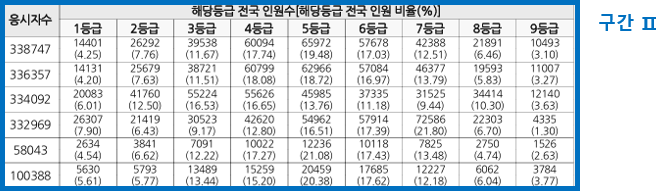 구간Ⅱ는 영역별(또는 선택과목별) 응시자 수와 등급별 전국 인원 비율을 보여주는 부분이다. 이 수치는 시험의 규모와 난도, 선택과목 선호도 등을 해석할 수 있는 중요한 단서가 된다.