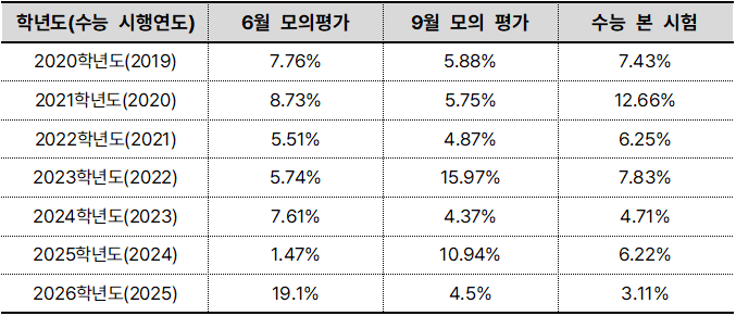 영어와 한국사는 절대평가로 실시되기 때문에 성적표에 백분위나 표준점수가 제시되지 않고, 원점수와 등급만 제공된다. 이때 확인해야 할 부분이 바로 등급별 인원 비율이다. 상대평가 과목에서는 1등급 비율이 4%로 고정되어 있지만, 절대평가 과목은 일정 점수 이상을 받은 학생이 모두 1등급이 되기 때문에 해마다 비율이 달라진다. 따라서 1등급 비율을 보면 시험의 난이도를 간접적으로 파악할 수 있다. 예를 들어 2026학년도 수능에서는 영어 1등급 비율이 3.11%로 나타나 비교적 어렵게 출제되었다는 평가를 받았고, 반대로 2021학년도 수능에서는 1등급 비율이 12.66%로 높아 상대적으로 쉬웠다는 분석이 나왔다. 이처럼 절대평가 영역은 ‘등급 분포’ 자체가 곧 난이도 지표로 기능한다.