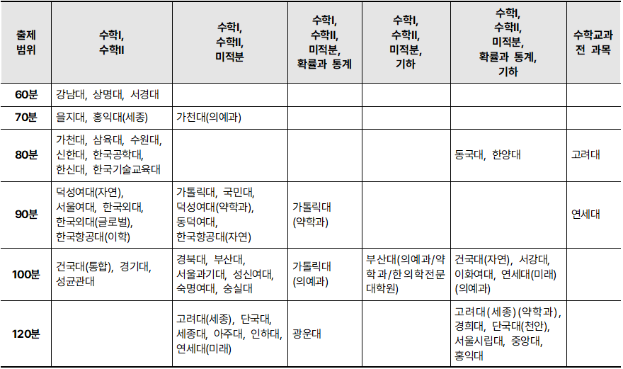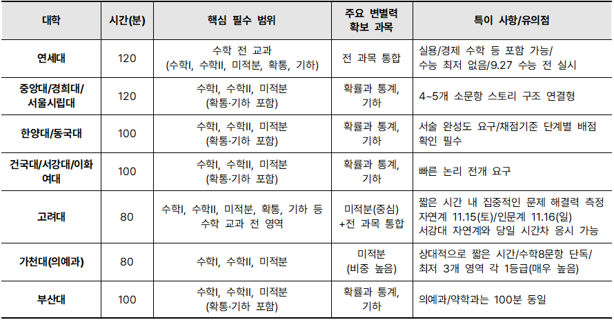 3.2. 2026학년도 주요 대학별 수리논술 출제 범위 및 고사 시간 상세 분석