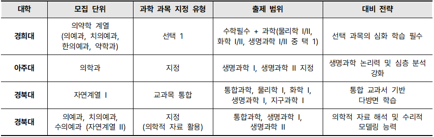 대부분의 대학이 과학논술을 폐지했음에도 불구하고, 의약학 계열에서는 여전히 과학적 소양을 요구하는 대학들이 남아있습니다. 이들은 특정 과학적 지식을 수학적 분석 능력과 통합하여 평가함으로써, 미래 전문직으로서 요구되는 기초 역량을 검증하고자 합니다. 2026학년도에 과학논술을 포함하는 대학은 경북대, 경희대 의약학 계열, 아주대 의학과 세 곳에 불과하며, 각 대학의 출제 방식은 구분됩니다.