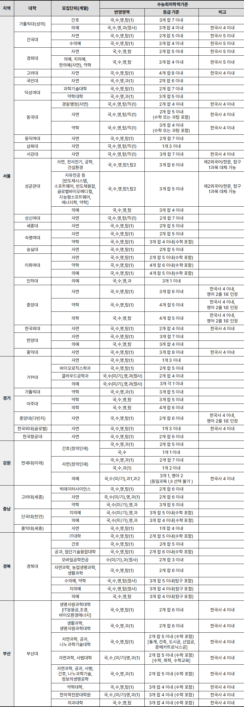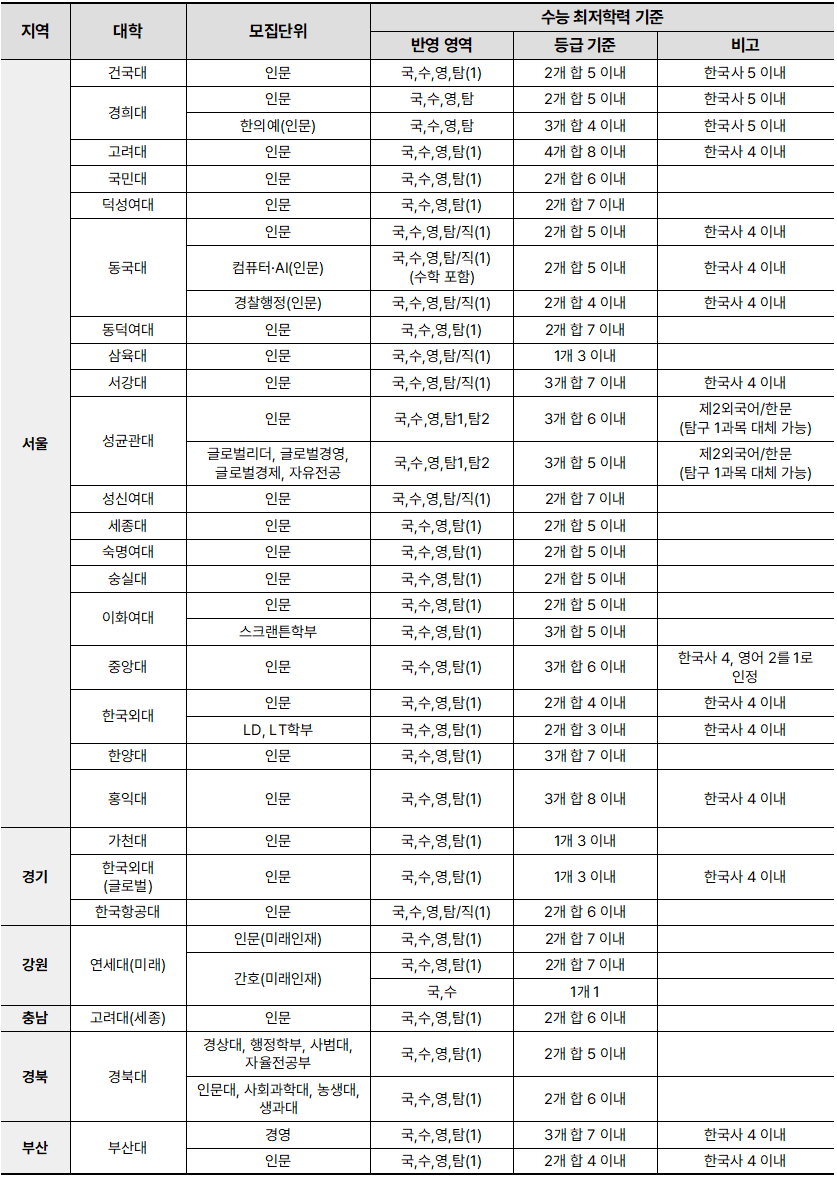 <표 1> 2026학년도 인문계열 수능 최저학력 기준