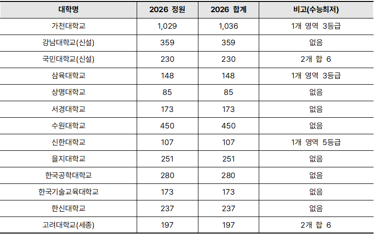선발 규모 면에서는 가천대학교가 1,036명으로 가장 많고, 그 뒤를 강남대(359명), 수원대(450명), 한신대(237명), 한국공학대(280명) 순으로 이어집니다. 인원이 증가한 대학으로는 가천대(+24명), 삼육대(+21명), 을지대(+32명) 등이 있으며, 고려대 세종(-45명), 서경대(-43명) 등은 소폭 감소했습니다. 전체 흐름은 확대 방향으로 기울어져 있어, 수험생 입장에서는 선택의 폭이 꾸준히 넓어지고 있는 상황입니다.