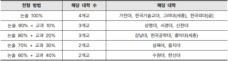 <표 2> 약술형 논술 전형 방법별 논술·교과 반영 비율