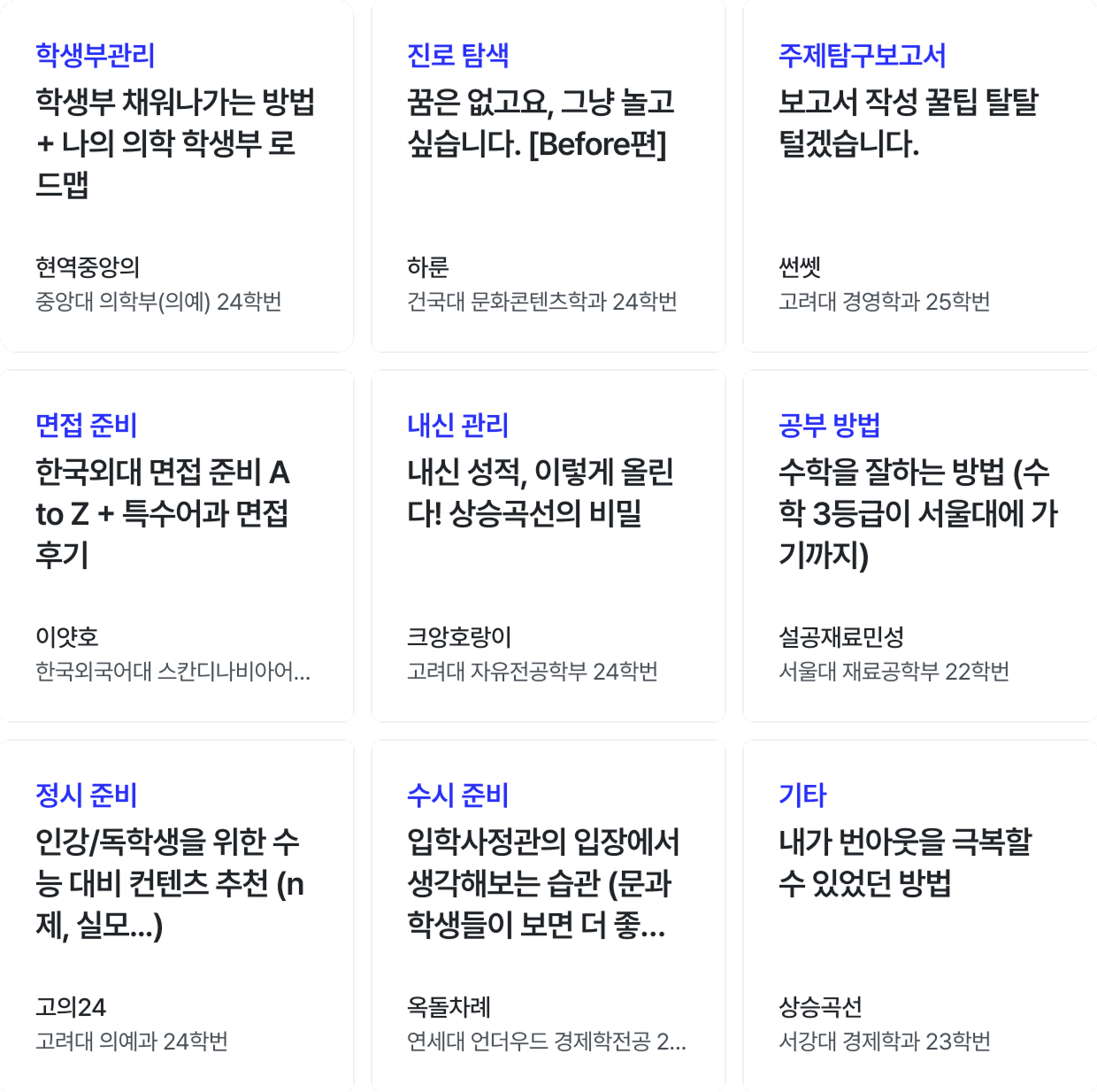 탐구보고서는 물론 스토리노트, 입시 칼럼 등 매월 수십~수백 건의 새로운 콘텐츠가 업데이트 됩니다.