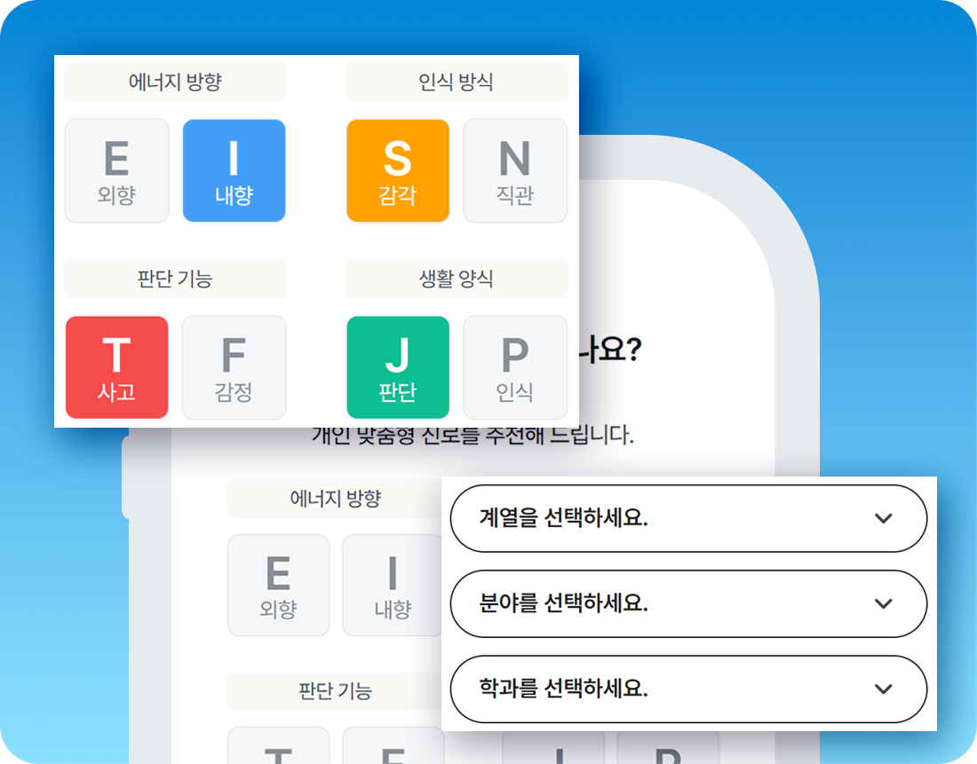 자신의 MBTI를 선택하면 진로를 추천해 드려요. 성향과 관심 전공을 선택하면 연관된 탐구 주제를 추천받을 수 있어요!