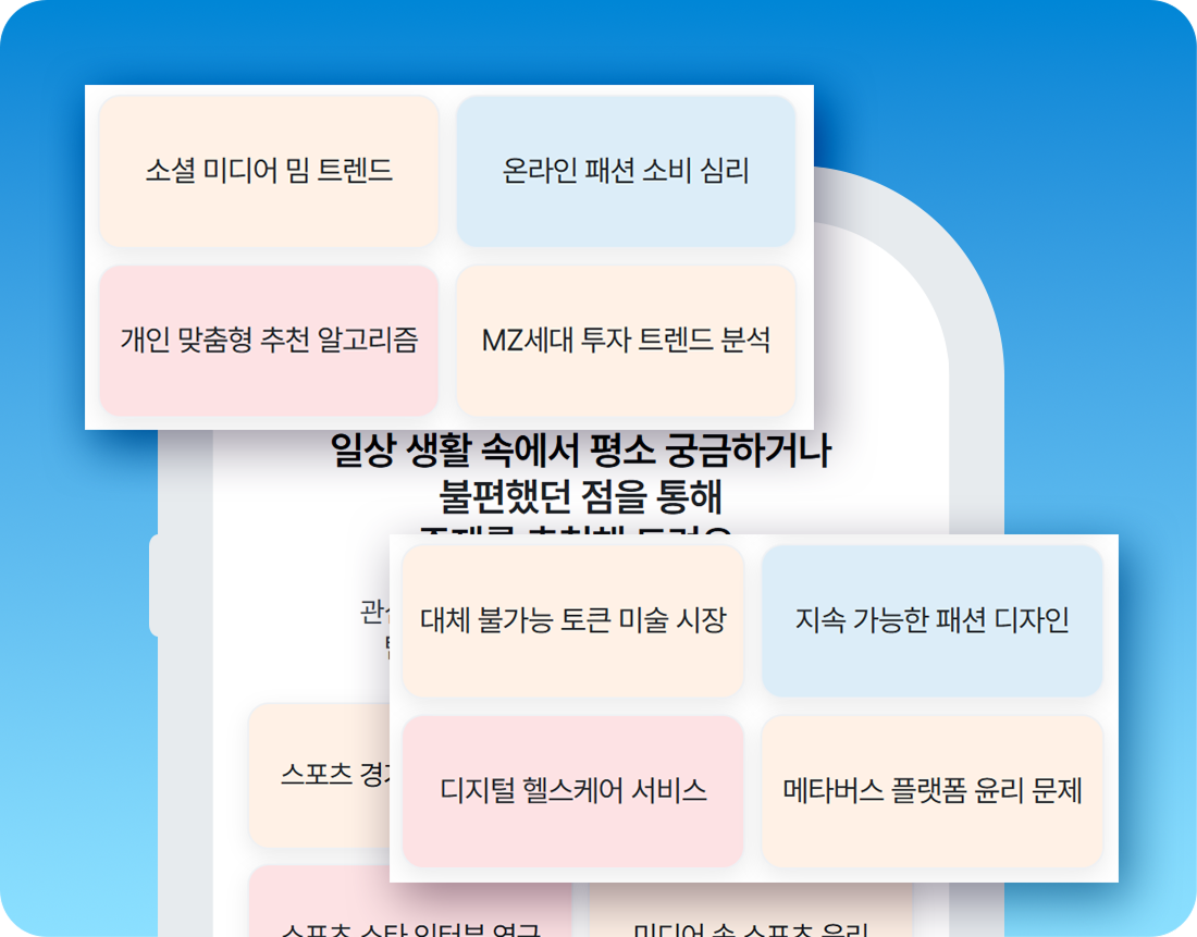 키워드를 선택하면, 실생활에 밀착된 참신한 탐구 주제를 간편히 추천받을 수 있어요!