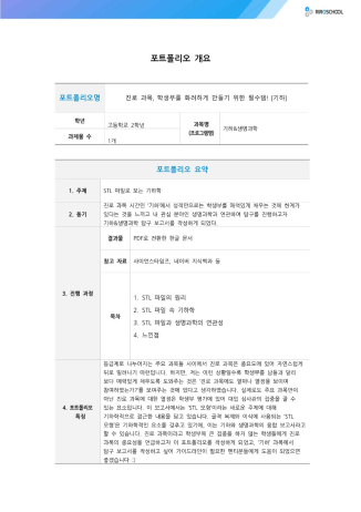 등급제로 나누어지는 주요 과목들 사이에서 진로 과목은 중요도에 있어 자연스럽게 뒤로 밀려나기 마련입니다. 하지만, 저는 이런 상황일수록 학생부를 남들과 달리 보다 매력있게 채우도록 도와주는 것은 ‘진로 과목에도 얼마나 열정을 보이며 참여하였는가?’를 보여주는 것에 있다고 생각하였습니다. 실제로도 주요 과목만이 아닌 진로 과목에 대한 열정은 학생부 평가에 있어 대입 심사관의 집중을 끌 수 있는 요소입니다. 이 보고서에서는 ‘STL 모형’이라는 새로운 주제에 대해 기하학적으로 접근한 내용을 담고 있습니다. 골격 복제와 이식에 사용되는 ‘STL 모형’은 기하학적인 요소를 갖추고 있기에, 이는 기하와 생명과학의 융합 보고서라고 할 수 있습니다. 진로 과목이라고 학생부에 큰 집중을 하지 않는 학생들에게 진로 과목의 중요성을 언급하고자 이 포트폴리오를 작성하게 되었고, ‘기하’ 과목에서 탐구 보고서를 작성하고 싶어 가이드라인이 필요한 멘티분들에게 도움이 되었으면 좋겠습니다 :)