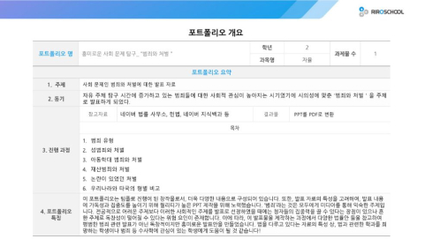 이 포트폴리오는 팀플로 진행이 된 창작물로서, 더욱 다양한 내용으로 구성되어 있습니다. 또한, 발표 자료의 특성을 고려하여, 발표 내용에 가독성과 집중도를 높이기 위해 퀄리티가 높은 PPT 제작을 위해 노력했습니다. ‘범죄’라는 것은 모두에게 미디어를 통해 익숙한 주제입니다. 전공적으로 어려운 주제보다 이러한 사회적인 주제를 발표로 선정하였을 때에는 청자들의 집중력을 끌 수 있다는 장점이 있으나 흔한 주제로 독창성이 떨어질 수 있다는 위험 요인이 존재합니다. 이에 따라, 이 발표물을 제작하는 과정에서 다양한 법률안 들을 참고하여 평범한 범죄 관련 발표가 아닌 독창적이지만 흥미로운 발표안을 만들었습니다. 법을 다루고 있다는 자료의 특성 상, 법과 관련한 학과를 희망하는 학생이나 범죄 등 수사학에 관심이 있는 학생에게 도움이 될 것 같습니다!