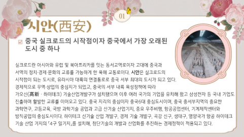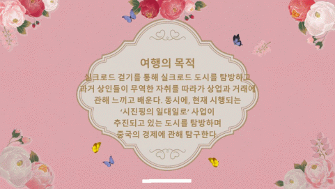 중국의 경제에 관심이 많아,과거 실크로드를 따라 도시와 문화를 탐구하고 싶었고, 이와 연계하여 21세기의 실크로드인 시진핑의 '일대일로' 사업 또한 탐구하며 현재 중국의 경제 및 문화에 대해 적극적으로 이해하고자 하였습니다.