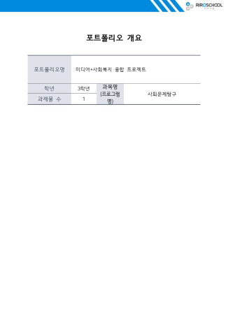안녕하세요. 저는 학창시절 제 생기부에 특히 탐구역량을 어필하기 위해 많은 분야를 엮어, 보고서를 작성했는데요, 이번 글에서 제공해드릴 포토폴리오는 사회문제탐구 과목 시간에 미디어와 사회복지 분야를 융합해 진행한 프로젝트입니다.