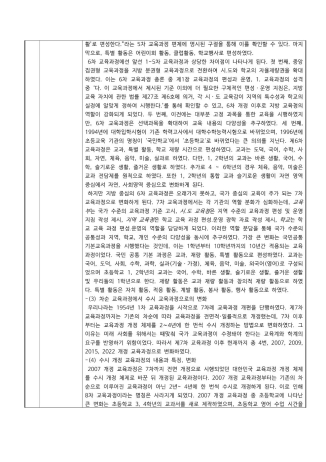 (1) 초등교육의 사전적 의미와 한국 교육과정의 수립 / (2)1~7차 교육과정까지의 변화 이유와 내용, 특징 / (3) 차순 교육과정에서 수시 교육과정으로의 변화 / (4) 수시 개정 교육과정의 내용과 특징, 변화 / (5) 교육과정 적용 시기