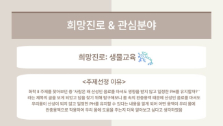 이 포트폴리오는 화학2 시간에 심화탐구 수행평가로 진행하였습니다. 화학2에 나오는 내용 중에서 완축용액이란 무엇인지 알고 생체 내에서 어떤 완충용액이 존재하며 우리 몸에서 어떻게 작용하는지 탐구하였습니다.