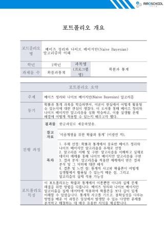 본 포트폴리오는 베이즈 정리(Bayesian Theorem)와 나이브 베이지안(Naive Bayesian) 알고리즘을 심층적으로 탐구하고, 이를 통해 확률론적 사고를 실생활 문제에 적용하는 과정을 다룹니다. 베이즈 정리는 조건부 확률을 계산하는 중요한 방법론으로, 주어진 데이터를 기반으로 사건 발생의 확률을 업데이트하는 데 유용합니다. 이 포트폴리오에서는 베이즈 정리의 기초 이론을 설명하고, 나이브 베이지안 알고리즘을 데이터 분류 문제에 적용해 봄으로써 이론을 실용적인 방법론으로 확장해 나갑니다.