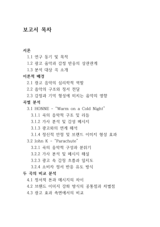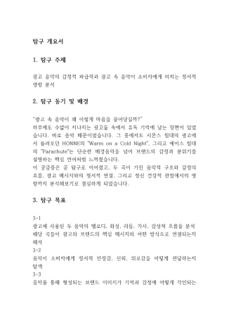 이 포트폴리오는 침대 브랜드 광고에 삽입된 두 곡, HONNE의 「Warm on a Cold Night」와 John K의 「Parachute」를 중심으로, 음악이 어떻게 소비자의 감정과 기억에 영향을 주는지를 분석한 보고서입니다.