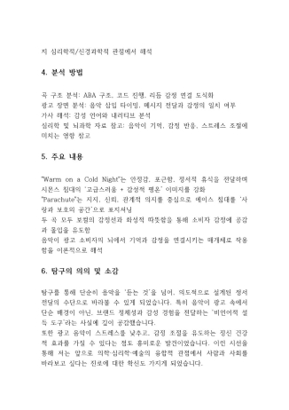광고는 단지 시각적 요소만으로 구성되지 않습니다. 배경에서 흐르는 음악이 소비자의 감정을 자극하고, 브랜드 이미지를 강화하며, 기억 속에 각인되는 데 중요한 역할을 합니다. 본 탐구는 두 곡의 가사, 화성 진행, 멜로디, 감정 흐름을 해석함으로써 광고의 감성 전략을 과학적・심리학적으로 분석하고자 했습니다.