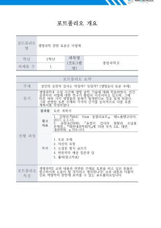 생명과학2 교과 내용과 연관된 주제로 토론을 하고 싶은 분들은 참고하시면 도움이 될 것이라고 생각합니다!교과 내용과 더불어 진로 역량까지 한번에 보여줄 수 있는 포트폴리오입니다