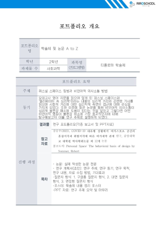 그래서 선택한 주제는 "퍼스널 스페이스 침범에 따른 비언어적 의사소통 연구" — 우리 학교 학생들을 대상으로 직접 설문, 실험, 관찰을 통해 데이터를 수집하고, 분석하고, 논문으로 정리하고, 마지막 발표까지 완주한 프로젝트입니다.