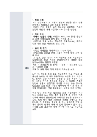 저는 평소 인공지능(AI)에 관심이 많았고, 특히 AI가 사람의 일을 대신하는 현상에 대해 궁금증을 가지고 있었습니다. 그러던 중 기자처럼 창의력과 판단력이 필요한 직업까지도 AI가 대체하고 있다는 사실을 알게 되었고, ‘로봇 저널리즘’이라는 주제를 중심으로 AI가 언론에 어떤 영향을 미치고 있는지 자세히 알아보고 싶어졌습니다.
