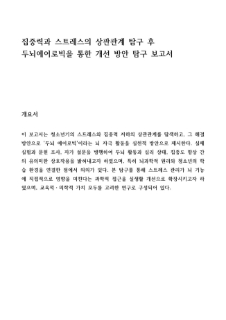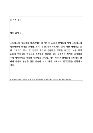 고등학교 생활 동안 가장 인상 깊었던 활동은 ‘집중력’과 ‘스트레스’라는 주제를 뇌 과학적 시각에서 탐구한 경험이었습니다. ADHD와 같은 인지적 어려움을 겪는 학생들이 학습 현장에서 어떻게 집중을 회복할 수 있을까에 대한 호기심에서 출발하여, ‘두뇌 에어로빅’이라는 신경인지 훈련법이 실제로 도움이 될 수 있을지를 과학적 근거를 바탕으로 분석했습니다.