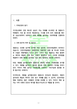 지구온난화로 인한 해수면 상승이 초래하는 피해에 대해 조사하던 중, 영종도가 가장 큰 피해를 입을 수 있는 지역이라는 기사를 접하게 되었습니다. 해당 기사에서는 인천 지역, 특히 해안과 접한 영종도 지역이 장기적으로 침수 위험에 놓일 수 있다는 분석을 담고 있었습니다. 이에 따라 저는 영종도를 해수면 상승으로부터 보호하기 위한 실질적인 방안을 고민하게 되었고, 그 중에서도 ‘제방 설치’에 초점을 맞추어 탐구를 진행하기로 결정하였습니다.