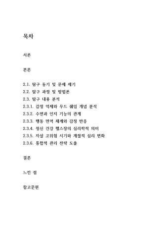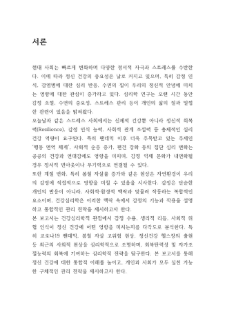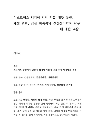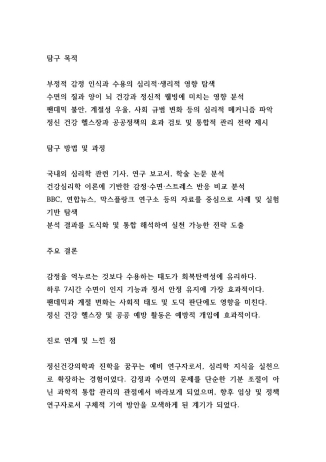 이 보고서는 ‘스트레스 시대의 심리 적응’을 주제로 감정 억제, 무드 쉐임, 수면 부족, 계절 변화, 팬데믹 불안, 자살 고위험 시기 등 정신 건강에 영향을 주는 다양한 요인을 건강심리학 관점에서 분석한 탐구 보고서입니다.