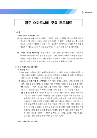 다. 이러한 문제를 해결하기 위해서는 단순한 행정적 대응을 넘어, 지속 가능한 경제 모델과 미래 성장동력의 창출이 필요하다. 본 보고서는 ‘스마트시티’라는 미래 도시 모델을 광주에 접목시킴으로써, ICT 기반의 첨단 기술을 활용한 신산업 육성, 일자리 창출, 기업 생태계 혁신 등 경영적 측면에서의 해법을 모색하고자 한다. 특히 스마트팩토리, NFT, 공유경제와 같은 기술과 플랫폼은 광주지역 기업의 경쟁력을 강화하고, 새로운 시장을 형성할 수 있는 기회를 제공할 것이다. 본 보고서는 이러한 경영 전략이 어떻게 스마트시티와 융합되어 지역 경제의 활로를 개척할 수 있는지를 분석하고, 광주가 미래 지향적 도시로 전환되는데 기여하고자 하는 데 목적이 있다.