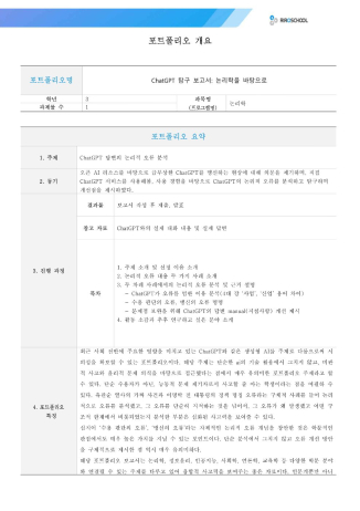 최근 사회 전반에 주요한 영향을 미치고 있는 ChatGPT와 같은 생성형 AI를 주제로 다룸으로써 시의성을 확보할 수 있는 포트폴리오이다. 해당 주제는 단순한 ai의 기술 활용에서 그치지 않고, 비판적 사고와 윤리적 문제 의식을 바탕으로 접근했다는 점에서 매우 유의미한 포트폴리오 주제라고 할 수 있다. 단순 수용자가 아닌, 능동적 문제 제기자로서 사고할 줄 아는 학생이라는 점을 어필할 수 있다. 유관순 열사의 가짜 사건과 이명박 전 대통령의 정책 명칭 오류라는 구체적 사례를 들어 논리적으로 오류를 분석했고, 그 오류를 단순히 지적하는 것을 넘어서, 그 오류가 왜 발생했고 어떤 구조적 한계에서 비롯되었는지 분석한 부분은 심화된 사고력을 보여줄 수 있다. 심지어 ‘수용 판단의 오류’, ‘맹신의 오류’라는 자체적인 논리적 오류 개념을 창안한 것은 학문적인 관점에서도 매우 높은 가치를 지닐 수 있는 포인트이다. 단순 분석에서 그치지 않고 오류 개선 방안을 구체적으로 제시한 점 역시 매우 유의미하다. 해당 포트폴리오 보고서는 논리학, 정보윤리, 인공지능, 사회학, 언론학, 교육학 등 다양한 학문 분야와 연결될 수 있는 주제를 다루고 있어 융합적 사고력을 보여주는 좋은 자료이다.