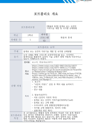 본 포트폴리오는 확률과 통계 과목에서 학습한 기본 통계 개념과 진로 분야인 약학분야와 관련지어 수행한 ‘유전자 가위기술의 규제‘에 대한 활동을 담고 있습니다. 많이 알려져 있는 소재에 대한 자신만의 독창적인 활동은 어떻게 하면 좋을지에 대한 가이드라인을 제공합니다.