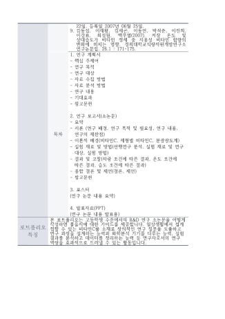 본 포트폴리오는 고등학생 수준에서의 R&D 연구 소논문을 어떻게 작성하면 좋을지에 대한 가이드를 제공합니다. 일상생활에서 쉽게 접할 수 있는 비타민C를 소재로 창의적인 연구 질문을 도출하고 연구 과정을 설계하는 능력과 화학분석 기기를 다루는 능력, 실험 결과를 분석하고 데이터를 정리하는 능력 등 연구자로서의 연구 역량을 효과적으로 드러낼 수 있는 활동입니다.